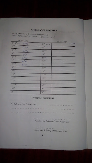 This page mainly contains the SIWES students attendance registry, and it meant to be completed and entered by the person you report to in your company every week. it has a format of X/Y, where X – is the total number of days attended and Y – is the total number of work days of your company. it also has provision for your industry base supervisor to lay an overall comment about you and as well sign and stamp it.